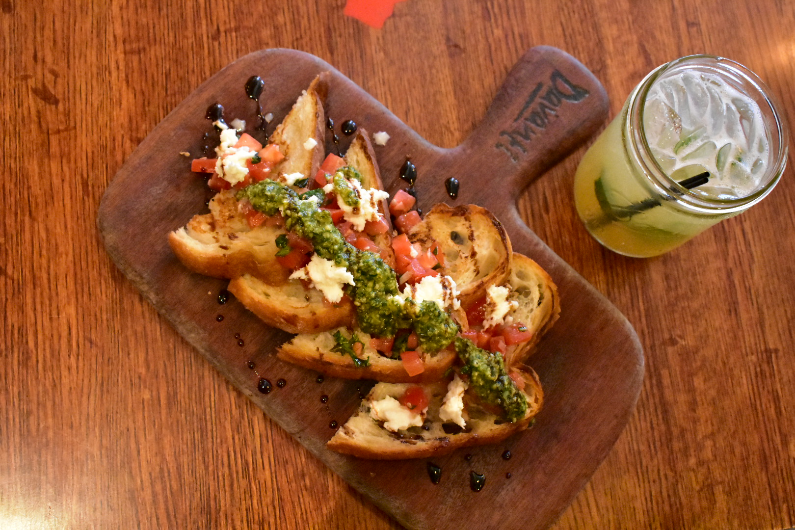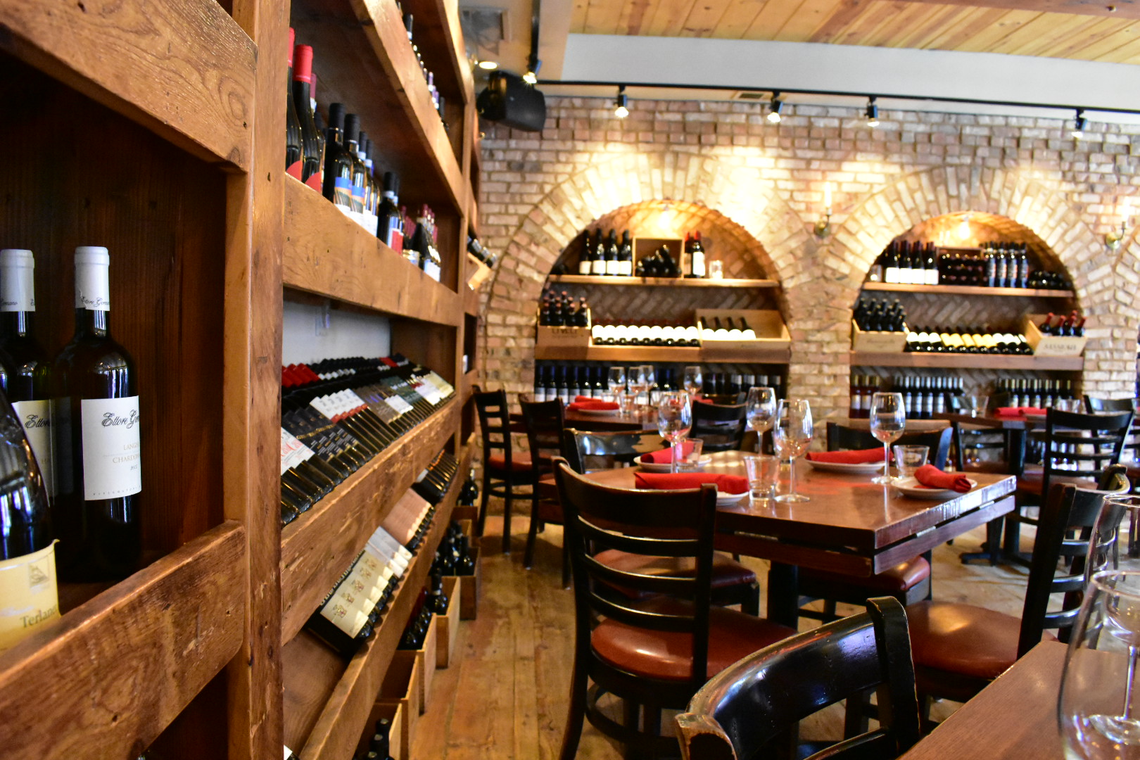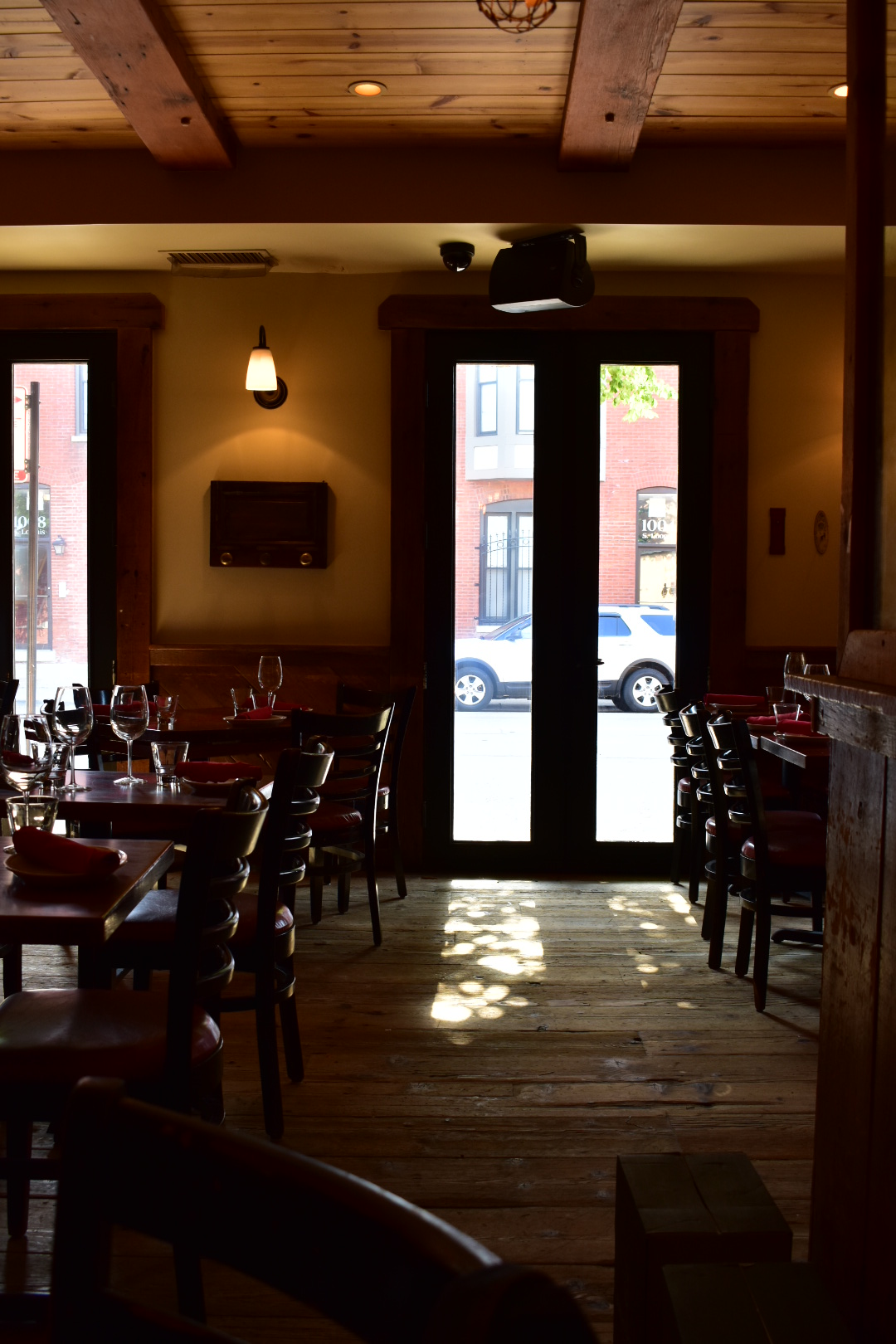 The atmosphere is rustic chic. The tables have their numbers painted on their beautiful surface. The lighting is dim and cozy. One wall in the back is lined with wine. Back when I was a drinker, I would always buy a bottle because you’ll want to sit, stay, and revel in the experience. Two walls are lined with floor to ceiling windows. There are high top and regular tables.