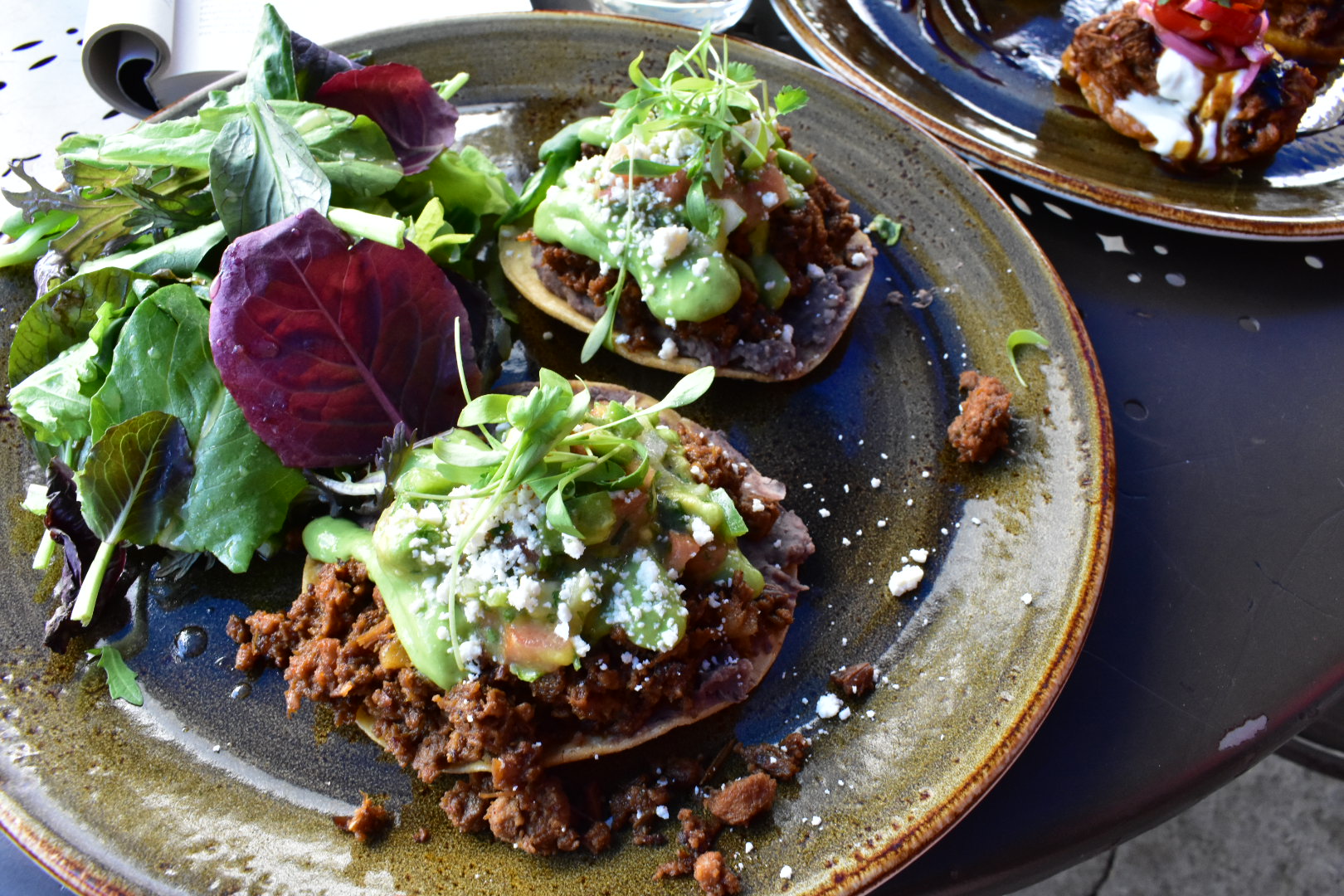 The decor is fabulous. At the bar, there are blue velvet chairs. Equal parts comfy and luxurious. There are floor to ceiling windows looking onto downtown, which open up during service to let in the fresh mountain air. There is a small patio with four tables. Succulents adorn each table. The dining area is beautiful decorated with dark wood. An upstairs has extra seating for parties or the busy season. Spanish music plays in the background. (I danced on my way in and out.)